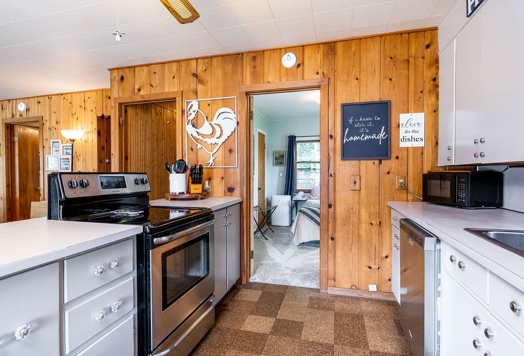Nestled in a small cove on a large lake, this lakefront cottage includes a 20' pontoon, 2 kayaks, paddle boat and dock from May through October (weather permitting). It has a private beach and 66' of shoreline. Plus an elevated front deck; side patio; bonfire pit and gas BBQ grill. Swan Cottage has 2 large bedrooms (plus twin daybed in semi-private nook); 1 bathroom; and driveway parking. It is dog friendly, however, the yard is not fenced.