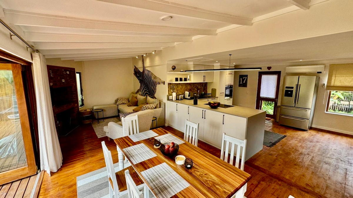 Tucked away in a milkwood garden, facing lush bush and mountain - this stylish coastal hideaway always has guests wishing they'd booked for longer stays. A short walk within the private nature estate finds the viewing deck overlooking all of Plettenberg Bay. Enjoy the unspoilt beauty of one of SA's most pristine coastal beaches . Wake up to birdsong; take long beach walks; spot dolphins; braai & chill on the sunny patio, before spectacular sunsets give way to African stars. Live lekker