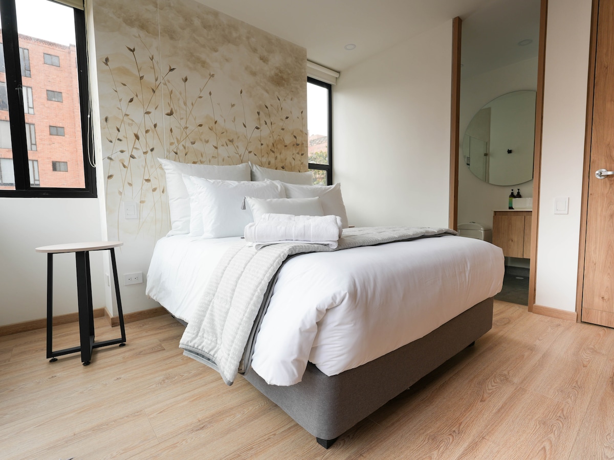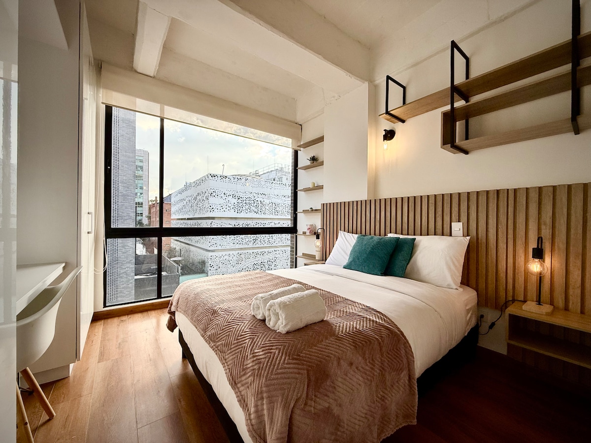 Enjoy & relax in this calm, stylish, illuminated unit 1 bedroom apto, with 4 set dinner table, sofa bed for additional person, 3.5 meters ceiling to floor, Located in the best area of Bogota DC, great for buz or family & friends trips who want to stay in a loft, it will your home, it has morning sun, everything is walking distance great selection of restaurants, coffee shops, coworking spaces, corporate offices , markets, and much more, close by a great Park del Museo del Chico., Park de la 93