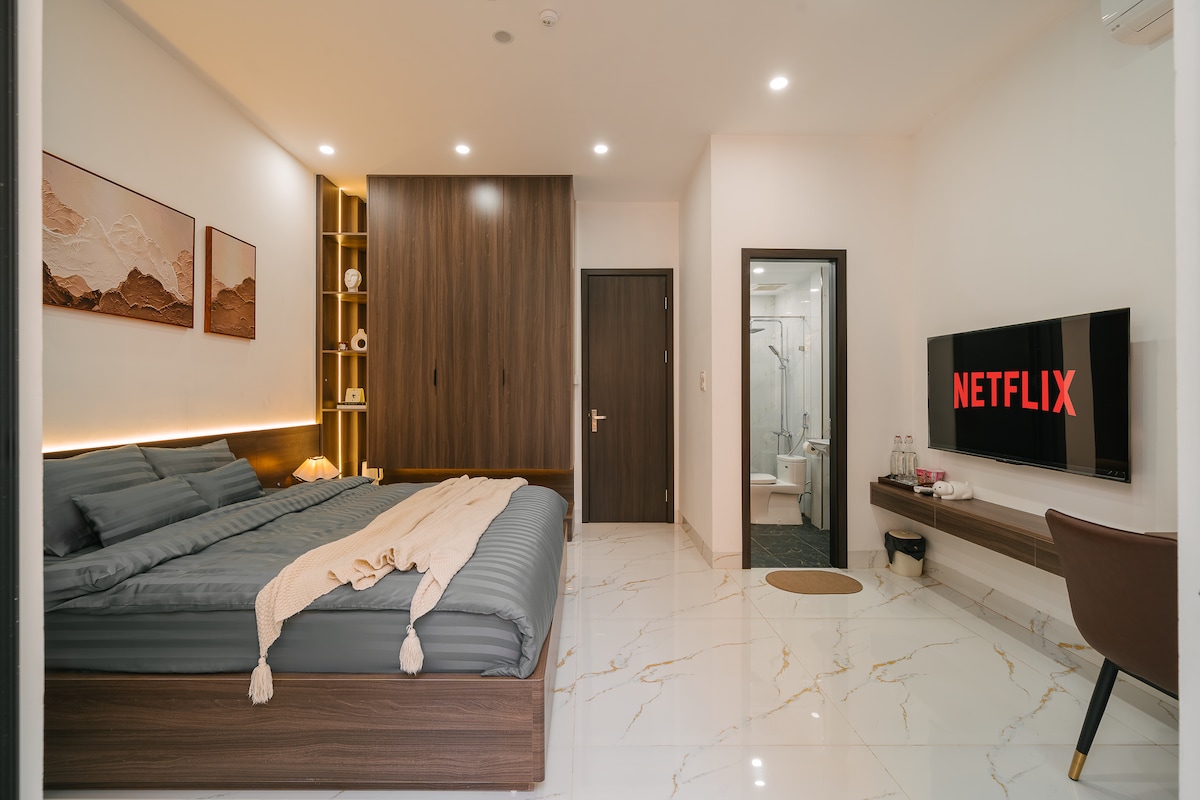 🌿 Studio 55m² – Balcony & Projector | Central Ba Dinh 🏡 Details: Size: 55m², private balcony Bed: 1 king bed (1.8m x 2m) with a soft mattress Amenities: Projector, refrigerator, electric kettle, Netflix TV, safety box, complimentary drinking water, coffee, and tea in the room Bathroom: a bathtub and standing shower, including 5 sets of towels and 5 sets of personal toiletries Included Services: Free breakfast, swimming pool, and complimentary basement parking