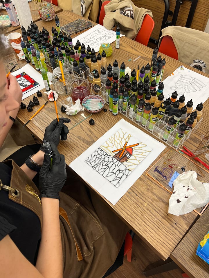 მარმარისი: შექმენით ვიტრაჟი შუშის ფურცელზე. გამოიყენეთ კონტურული საღებავი კონტურების მოსახაზად. შეავსეთ სექციები მინის საღებავებით და ფერების ფენებით სიღრმისთვის. ფუნჯით დაამატეთ დეტალები. გაშრობა იმავე დღეს.