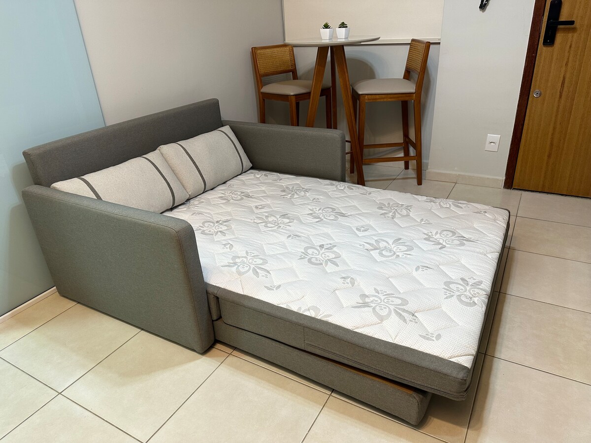 სრულად კონდიცირებული, მდიდრულად გაფორმებული ბინა, 1 საწოლი 150–179 სმ, ძალიან კომფორტული ლეიბი, 1 საძინებელი კიდევ ერთი 150–179 სმ ზომის საწოლით. შენობა ლიფტით. სუპერმარკეტთან, აფთიაქთან და საცხობთან ახლოს. სავაჭრო ცენტრი მანქანით 5 წუთის სავალზეა. იდეალური ადგილი თქვენთვის და თქვენი ოჯახისთვის. დასაშვებია 1 შინაური ცხოველის თანხლებით სტუმრობა (დამატებითი გადასახადი: 50 რეალი ღამეზე).