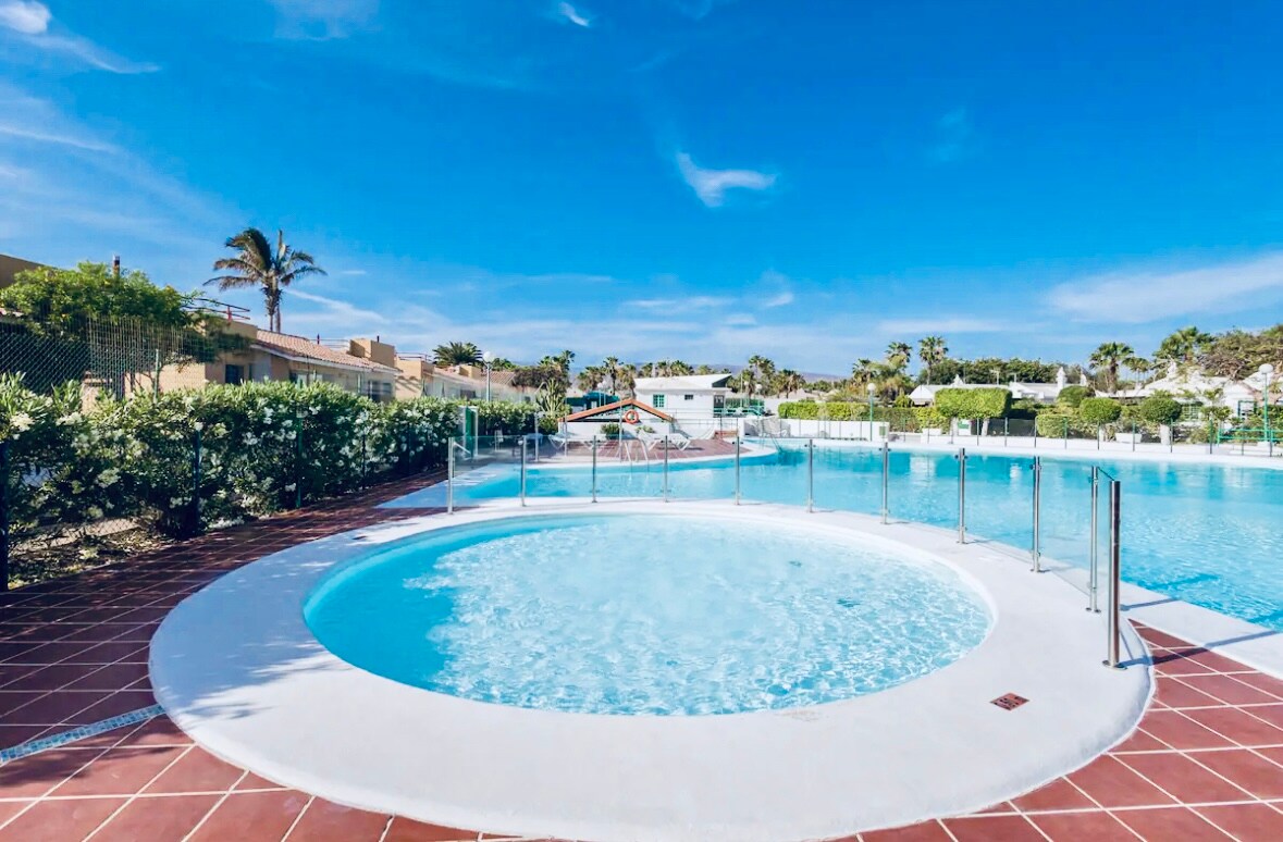 โญ Elegant, warm and cosy bungalow with a spectacular terrace and wonderful views of the ocean, the Maspalomas dunes and the horizon of Playa del Inglรฉs. It features a spacious living-dining room with air conditioning, two bedrooms with fans (one of them also with air conditioning), a fully equipped kitchen and a full bathroom. The complex offers parking, a swimming pool and a tennis court.