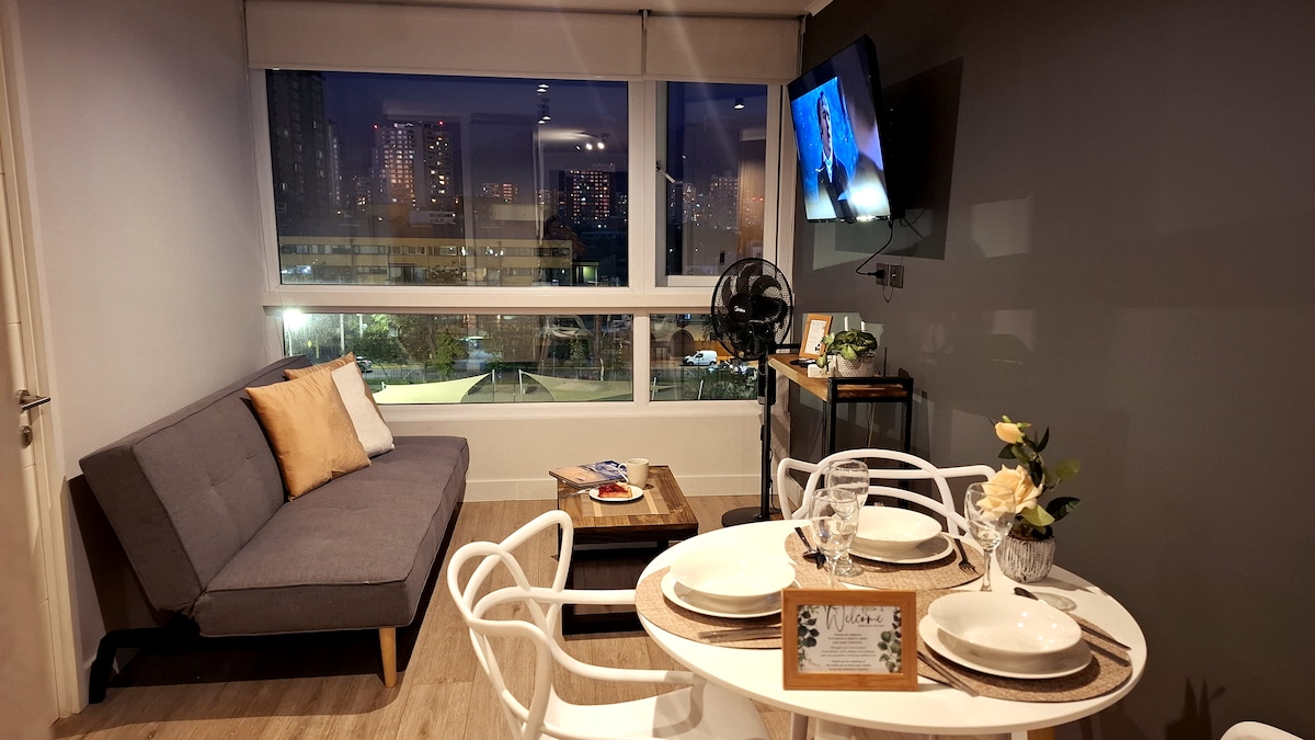 Wake up every morning to an impressive view of the Andes Mountains from this cozy and modern apartment. Brand new, tastefully decorated and fully equipped to make you feel at home. Perfect for couples, travelers, and families. If you’re coming with kids, they’ll sleep comfortably on the sofa bed. Located right in front of Irarrázaval Metro station on lines 3 and 5, with direct access to the entire city of Santiago. ⚡ 600MB symmetrical fiber optic internet: fast and stable connection.