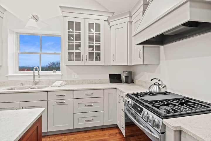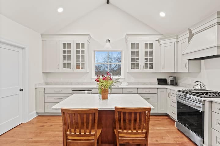 Სამზარეულო, კულინარიული თავშესაფარი, ხის ახალი იატაკი, რბილი კარადები და კვარცის სამუშაო ზედაპირები. 🍽️🔥 Აღჭურვილია უჟანგავი ფოლადის ტექნიკით – გაზქურით, ჭურჭლის სარეცხი მანქანით, მაცივრით და მიკროტალღური ღუმელით – ეს შეფ-მზარეულის ოცნებაა. Კუნძული, რომელსაც აქვს ბარი, იდეალურია ჩვეულებრივი სადილობისთვის, ხოლო ბუხარი, თუმცა არაფუნქციონალურია, გარემოს სითბოსთან შეხებას მატებს.