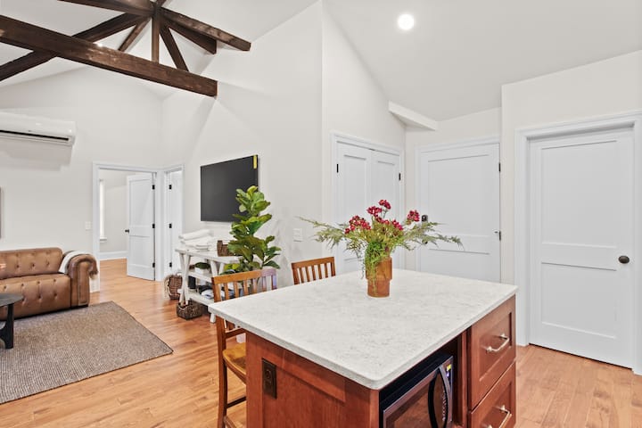 Მისაღები ოთახი, რომელიც მორთულია ხის იატაკითა და თანამედროვე ხელოვნების ნიმუშებით, გეპატიჟებათ განიტვირთოთ პლუშის ტყავის ტუფრებულ დივანზე 60-დუიმიანი ტელევიზორის წინ. 🛋️ Გჭირდებათ დამატებითი საძილე სივრცე? Დივანი გარდაიქმნება კომფორტულ დედოფლის ზომის გასაშლელ ლეიბად.