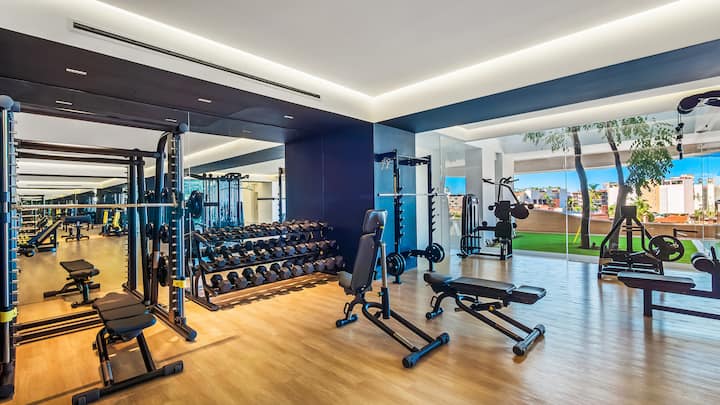 Ველოტრენაჟორი და თავისუფალი წონები მზადაა თქვენი ვარჯიშისთვის.