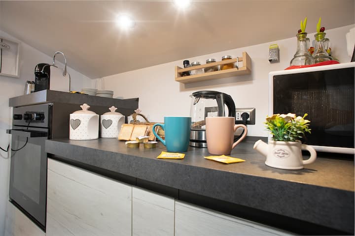 Სრულად აღჭურვილი სამზარეულო: სამზარეულო აღჭურვილია კვების მოსამზადებლად საჭირო ყველა მოწყობილობით: მაცივარი, ღუმელი, მიკროტალღური ღუმელი, ყავის აპარატი, ქურა, ქვაბები, ჭურჭელი. Შეგიძლიათ თავისუფლად მოამზადოთ სახლში ან, უბრალოდ, დილით დააგემოვნოთ ახალი ყავა.
