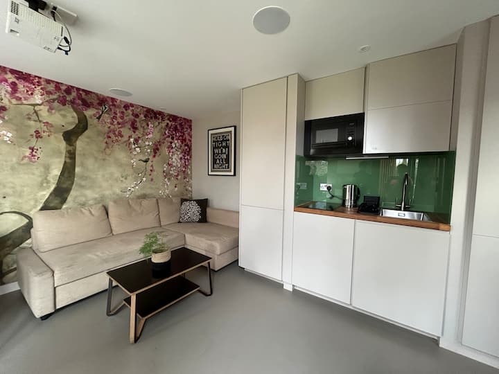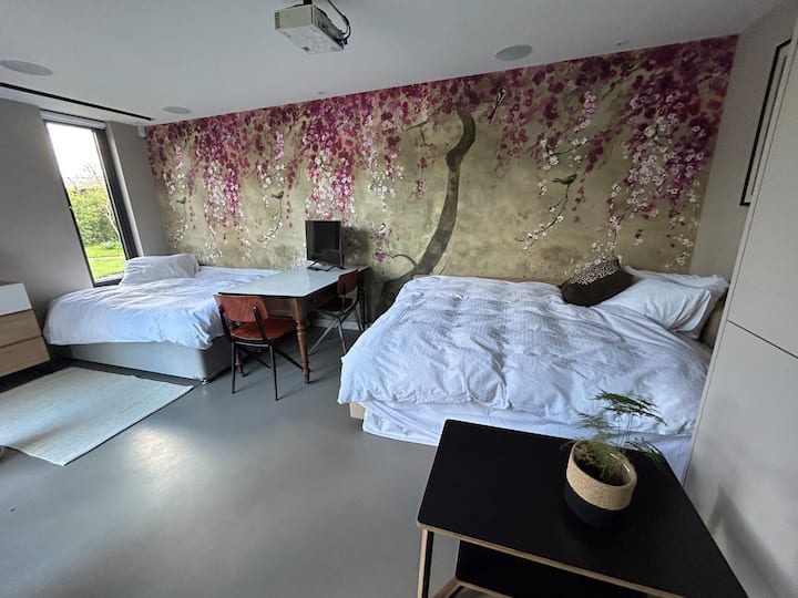 მთავარ სახლში ვცხოვრობ ჩემს ზრდასრულ შვილებთან და 5 კატასთან ერთად. Ამბიციური Grand Designs აშენება, პავილიონი ცოტა ხნის წინ შეიქმნა, როგორც სტუმრებისთვის განკუთვნილი სივრცე და თავშესაფარი ქალაქის შუაგულში.