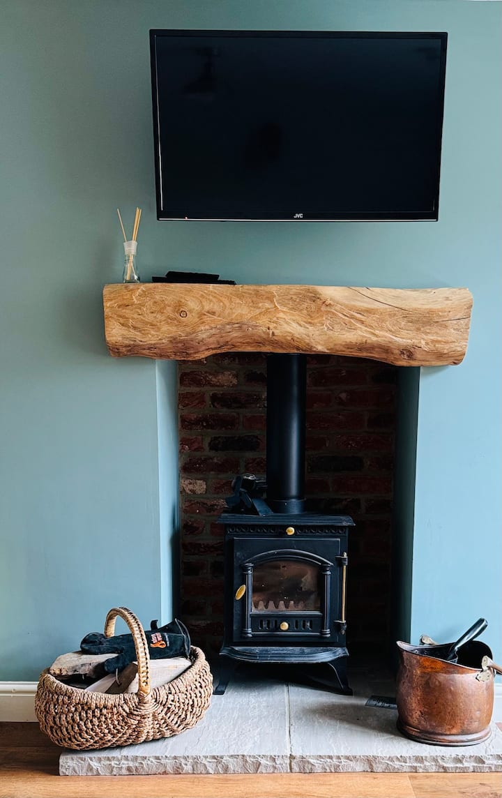 დასასვენებლად კარგი ყუთი წითელი ყუთითა და შეშის ღუმელთან ზის.