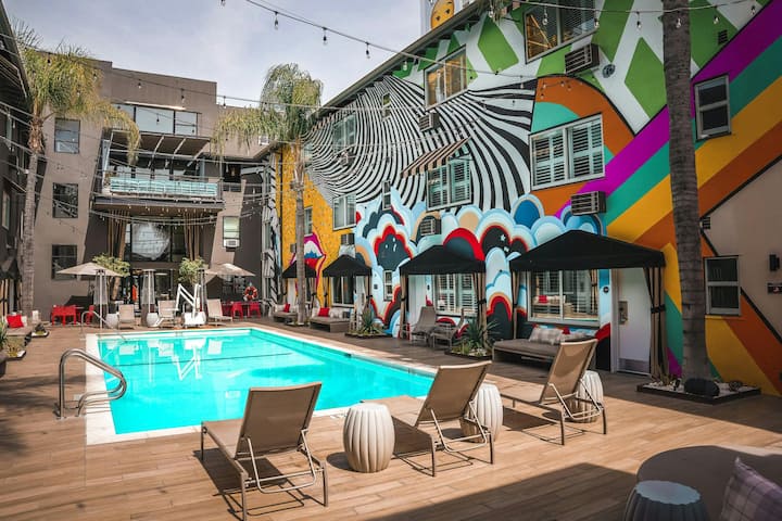 სანსეტ‑სტრიპის მეამბოხე სული დღემდე ცოცხალია სასტუმრო Ziggy‑ში. ჩვენს კედლებზე გამოფენილია მუსიკის იშვიათი რელიქვიები და ხელოვნების ორიგინალური ნიმუშები, რომლებიც შემოქმედებით განწყობაზე გაგიყვანთ. ჩვენს სათამაშო ოთახში შეგიძლიათ აირჩიოთ ინსტრუმენტები და სპონტანურად ჩაიწყოთ ჯემ‑სესია. დაესწარით კონცერტს სცენაზე, რომელზეც მარკ მაკგრათი და უაიკლიფ ჯინი გამოდიოდნენ. გაემართეთ რეტრო-სტილის ოთახებში, რომლებიც მორთულია ინდივიდუალური ფერწერული ნამუშევრებითა და ვინილის ფირფიტების კოლექციებით. პიცა გოგონა ადგილზე ამზადებს იტალიურ პიროგებს, ხოლო ჩვენი ცენტრალური მდებარეობა საშუალებას გაძლევთ, რამდენიმე ნაბიჯში იყოთ დასავლეთ ჰოლივუდის საუკეთესო ადგილებთან.