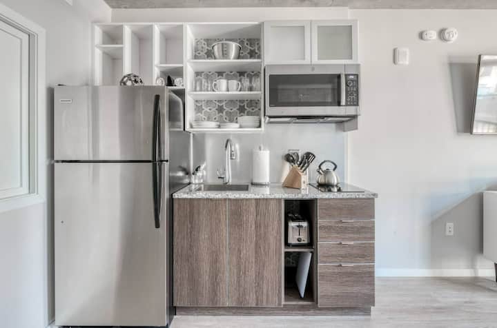 Ჩვენს ფართო სტუდიოს ტიპის ბინაში შესაძლებელია მაქსიმუმ ორი სტუმრის განთავსება დიდი ზომის საწოლით. Ამას გარდა, თქვენ გექნებათ ერთი თანამედროვე სააბაზანო, რომელშიც არის წვიმის საშხაპის თავი. Თქვენ მოგეწონებათ უჟანგავი ფოლადის საყოფაცხოვრებო ტექნიკა, გრანიტის ზედაპირები, ჩვეულებრივი ყავის აპარატი და სხვა. Ქალაქის დათვალიერების შემდეგ განიტვირთეთ ტელევიზორის წინ Roku ‑ სთან და შეუზღუდავ Wi ‑ Fi ქსელთან ერთად. Უმჯობესია, მოინახულოთ ქალაქის ღირსშესანიშნაობები საკუთარ აივანზე.