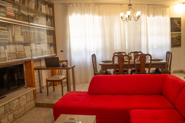 Იკავებს ქვედა სართულს. 6 ადამიანს შეუძლია დარჩენა 135 კვ.მ. სივრცეში 3 საძინებლით, სრულად აღჭურვილი სამზარეულოთი, შიდა და გარე სასადილო სივრცეებით, მისაღები ოთახით ბუხრით და დივნით, სააბაზანოთი, დიდი დაგებული ბაღით, მზის საწოლებით, საშხაპით და ხედით ჩვენი ზეთისხილის ხეების მამულამდე და აქილეონის სასახლემდე. Უფასო საპარკინგე ადგილი და ინტერნეტი Wi ‑ Fi კავშირი. Ის სრულად დამოუკიდებელია საპარკინგე ადგილიდან ქუჩისა და ბაღის გავლით.