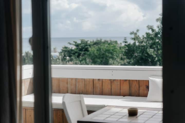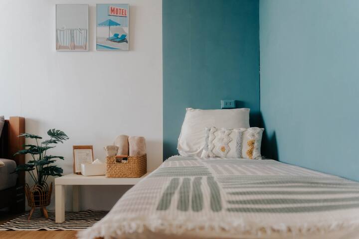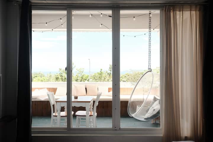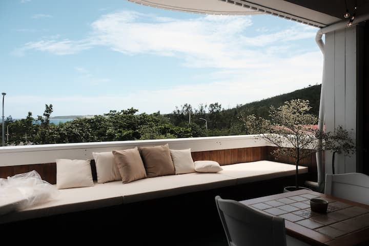 SolChill Inn | 3F ლურჯი იატაკიდან ჭერამდე ფანჯრები: ორადგილიანი ოთახი დამატებითი საწოლით ოთხისთვის | ცალკე აივნის ხედი | შინაური ცხოველებისთვის შესაფერისი