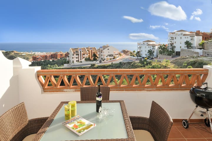 ტერასაფართო, ნაწილობრივ დაფარული ტერასა ზღვის, სანაპიროს და მთის ფანტასტიკური ხედებით. Ტერასაზე დგას ლუქს-კლასის მაგიდა 4 კომფორტული სკამით, 2 სავარძლით, პარაზოლითა და ვებერის ბარბექიუთი. Ეს იდეალური ადგილია ესპანეთის მზის ქვეშ უგემრიელესი საუზმის ან მყუდრო ბარბექიუს საღამოსთვის, საიდანაც ხმელთაშუა ზღვის ულამაზესი ხედები იშლება.