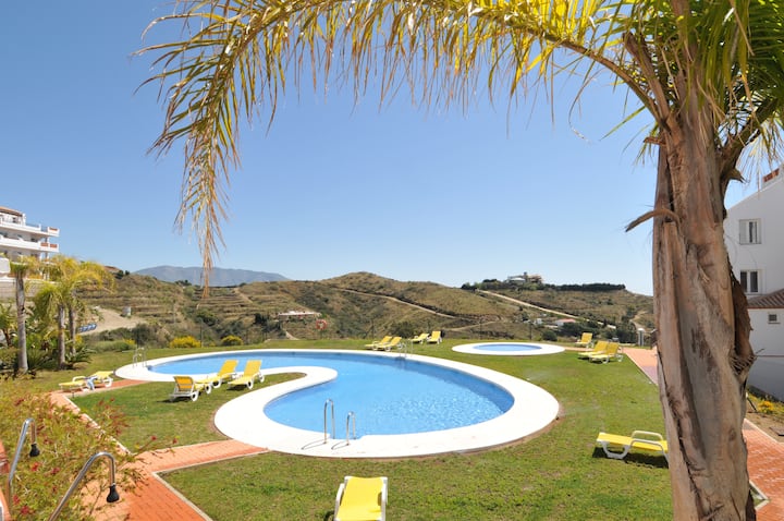 Ლუქს-კლასის სამხრეთით მდებარე ბინა ზღვის ხედით, 2 საძინებლით, 2 სააბაზანოთი, სრულად აღჭურვილი სამზარეულოთი და აუზით ლას-პალმერასში, კალაჰონდაში - მიჯას-კოსტა