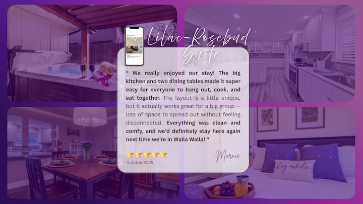 Lilac-Rosebud არის ფართო 4-საძინებლიანი, 3-საძინებლიანი საცხოვრებელი უოლა-უოლას ცენტრიდან სულ რაღაც 8 წუთის სავალზე. Ეს სახლი განკუთვნილია ოჯახებისთვის, ღვინის მოყვარულებისთვის, წყვილის ჯგუფებისთვის, კორპორაციული დასვენებისთვის და მეგობრების დასვენებისთვის. ეს სახლი კომფორტულად იტევს მაქსიმუმ 9 სტუმარს. Მას აქვს ორი ცალკე მისაღები ოთახი და ორი სრულად აღჭურვილი სამზარეულო. Იდეალურია როგორც კონფიდენციალურობის, ისე საზიარო შთაბეჭდილებების მაძიებელი ჯგუფებისთვის. Გაისეირნეთ გარეთ, რომ დატკბეთ ფართო გარე სივრცით და განიტვირთოთ ცალკე ჰიდრომასაჟის აუზში.