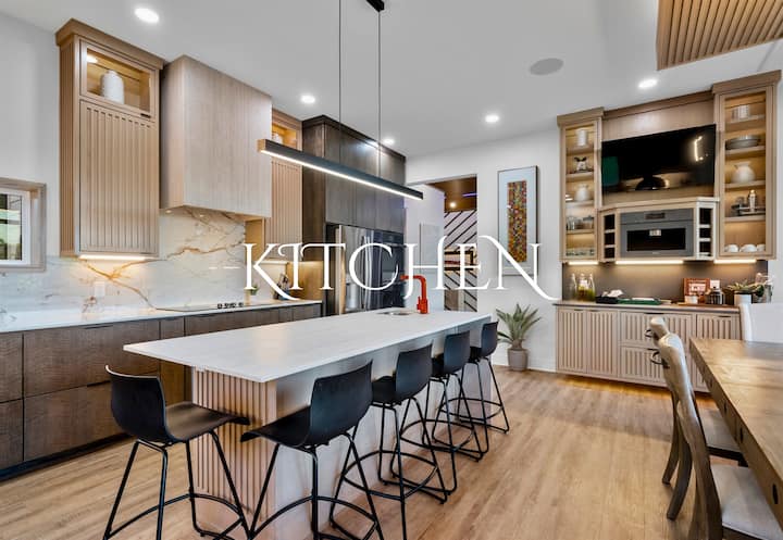 Ამ სახლის სამზარეულო კულინარიული ცენტრია, რომელიც აღჭურვილია უმაღლესი დონის საყოფაცხოვრებო ტექნიკით. Დიდი კუნძული ორმაგდება, როგორც მოსამზადებელი სივრცე და ყოველდღიური კვებისთვის მიმზიდველი ცენტრი, თავისი ელეგანტური სამუშაო ზედაპირებით, რბილი კარადების ფონზე. Კარადების ქვეშ ამოცანის განათება ანათებს დეტალურ საფარველს, რაც აუმჯობესებს ლუქს-კლასის შეგრძნებას. Მხატვრული განათება მაღლა დგას კომუნალური დიზაინის სტილით. Მიმდებარე ტერიტორიაზე მდებარეობს სასადილო სივრცე, რომელიც გარშემორტყმულია ფართო ფანჯრებით, რომლებიც გარედან სიმშვიდის ჩარჩოშია მოქცეული, რაც უზრუნველყოფს, რომ ყველა კერძს თან ახლდეს თვალწარმტაცი ფონი. Ეს სამზარეულო შექმნილია როგორც ყოველდღიური ტარიფისთვის, ისე სადღესასწაულო შეკრებებისთვის. ეს სამზარეულო გურმანების ელეგანტურობის თავშესაფარია.
