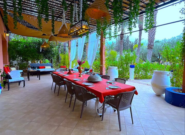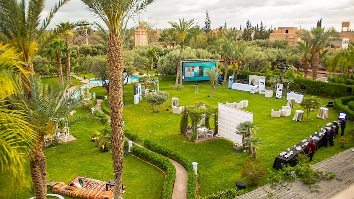 სტილური ვილა, რომელიც განკუთვნილია ჯგუფებისთვის ან კერძო ღონისძიებებისთვის. 8 ფართო საძინებელი, ორი საცურაო აუზი, დიდი ბაღი და გარე სივრცეები სადილობისა თუ დასასვენებლად. დაბადების დღეები, ფოტოგადაღებები ან სადღესასწაულო შაბათ‑კვირები მარაკეშში.