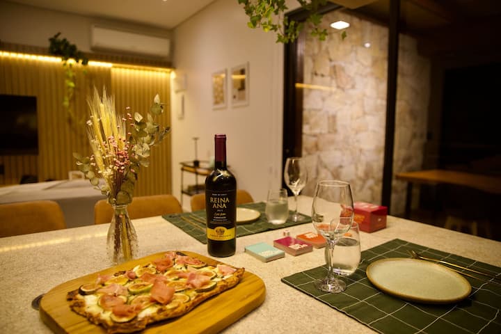- სამზარეულო: ინტეგრირებულია მისაღებ ოთახში, იდეალურია მათთვის, ვისაც უყვარს საჭმლის მომზადება, ის აღჭურვილია საყოფაცხოვრებო ტექნიკითა და ხარისხიანი ჭურჭლით, მათ შორის, მაცივრით, გაზქურის ზედაპირით, ღუმელითა და ჭურჭლის სარეცხი მანქანით 14 მომსახურება Brastemp, მიკროტალღური ღუმელი, airfryer, ბლენდერი, მიქსერი, ტოსტერი, ელექტრო წნევის გაზქურა, მიქსერი, ყავის საფქვავი, ჯეიმს F დანა, სახლის ბარის ნაკრები, სათვალე, სათვალე, კერამიკული ჭურჭელი და სხვა. Კუნძულზე განთავსებულია სამუშაო მაგიდა, რომელიც გათვლილია მაქსიმუმ 6 ადამიანზე.