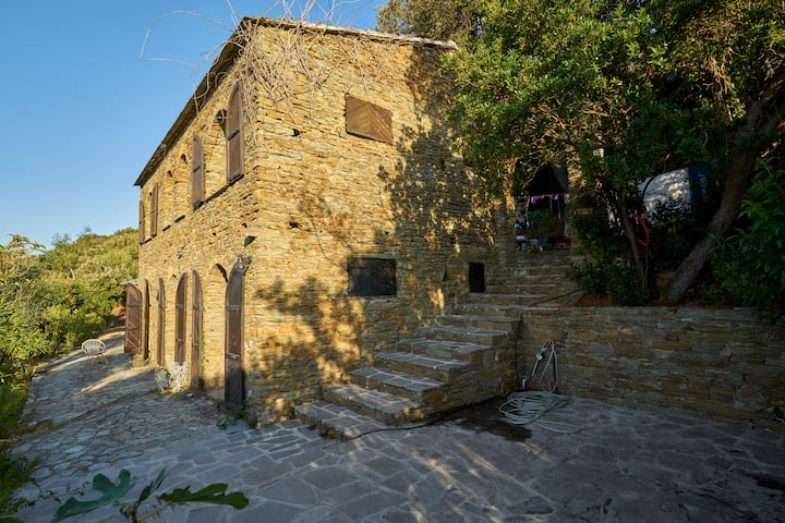 Ქვის ვილა, რომელიც გადაჰყურებს ქალაქს, ზღვასა და მთებს