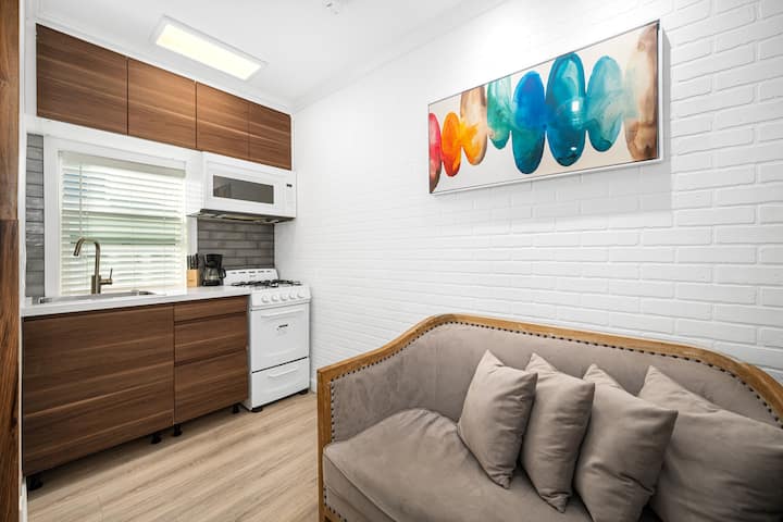 Სტუდიოს ტიპის ბინა - (1) დედოფლის ზომის საწოლი Smart Roku ტელევიზორითა და კარადით.