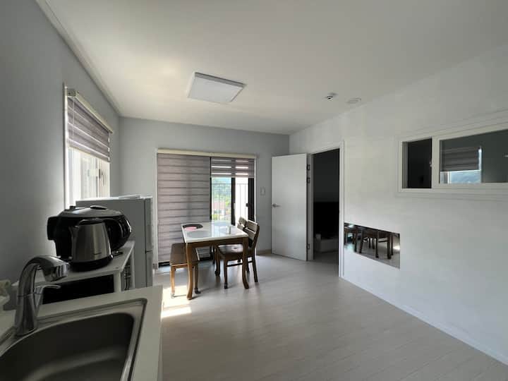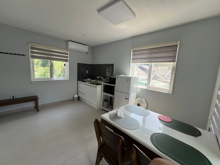 Ცეცხლისა და სუნის გამო სხვა სტუმრებისთვის გათვალისწინებულია, ჩვენ ვკრძალავთ ოთახში ღორის, თევზისა და ჩონგუკგანის მომზადებას, ასე რომ, გთხოვთ, გამოიყენოთ გარე დანიშნული ადგილი და მწვადის შეწვის ადგილი.