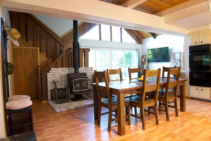 Იატაკის ღია გეგმა მოიცავს სრულად აღჭურვილ სამზარეულოს თანამედროვე საყოფაცხოვრებო ტექნიკით. Მისაღებ ოთახს აქვს იატაკიდან ჭერამდე ფანჯრები და შეშის ღუმელი, რომელიც ზამთრის დღეებსა და ღამეებში ხის სახლს მყუდროდ აქცევს. Გაისეირნეთ სასრიალო კარებიდან გემბანზე, საიდანაც თვალწარმტაცი ხედი იშლება მიმდებარე ტყეებზე. Ძირითად დონეზე არის ორი კარგი ზომის საძინებელი და აბაზანა-ტუალეტი. Ზემოთ არის დიდი საძინებელი კონდიციონერით/გათბობით, პატარა მომხიბლავი ლოფტი და სრული აბაზანა.