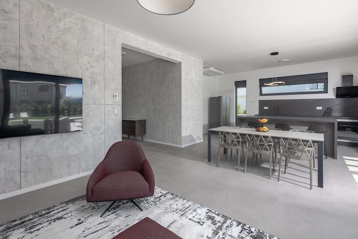 ეს ელეგანტური ვილა იდეალურად აერთიანებს თანამედროვე დიზაინს, ფუფუნებასა და ავთენტურ იშტრიულ შარმს, რაც იდეალურ გარემოს ქმნის ოცნების შვებულებისთვის, ყოველდღიური ქაოსისგან მოშორებით.