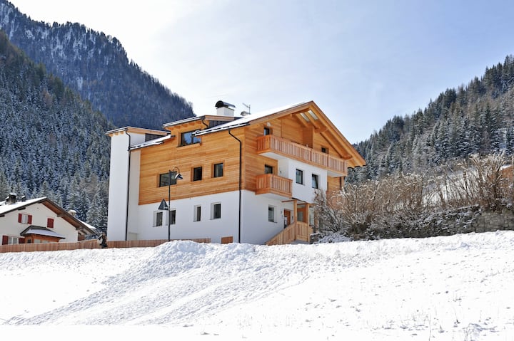თანამედროვე სტილი ადგილობრივი მასალებით, ბინას განსაკუთრებით მომხიბვლელ შტრიხებს აძლევს, რაც დეტალებზე ზრუნვასთან ერთად დაუვიწყარს გახდის თქვენს დღესასწაულებს დოლომიტის მთებში.