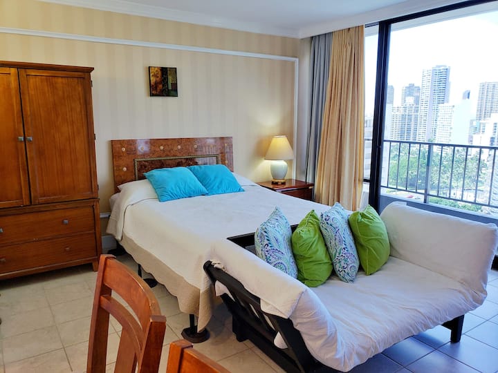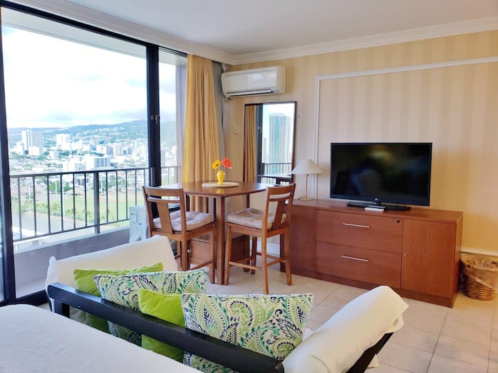 Ჩვენი სტუდიოს ტიპის აპარტამენტი ვაიკიკის სამეფო ბაღის შიგნით კერძო საკუთრებაა. Ეს სტუდია მდებარეობს მე-20 სართულზე ფართო საცხოვრებელი სივრცით.
