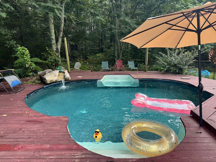 Ჩართეთ ჩანჩქერი აუზში და დააბრუნეთ ბუნებრივი ქვის პატიოზე, კოის აუზის გვერდით. Გარე ბუხარი, ცეცხლის ნამსხვრევები და ხორცის მწეველი თქვენს დასვენებას ელოდება.