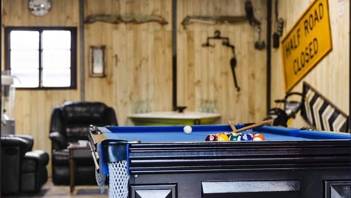 Სათამაშო ოთახი ბარით, აუზის მაგიდით, Dart Board-ით, ბარათებით, Connect 4-ით და გოლფ-კლუბებით.