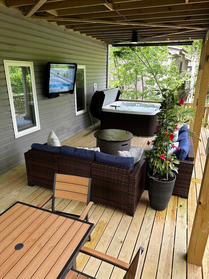 Შეიკრიბეთ 10 ადგილიანი დიდი სასადილო მაგიდის გარშემო, ხოლო დამატებითი მაგიდა ხელმისაწვდომია უფრო დიდი ჯგუფებისთვის ან სათამაშო ღამეებისთვის. Გადადით გაშლილ გემბანზე - შეავსეთ ბლეკსტოუნის ბრტყელი გრილი, პროპანის ბარბექიუ, სათხილამურო და ველო კაუჭები, გარე სასადილო სივრცე და ხეებს შორის განთავსებული პირადი ჰიდრომასაჟიანი აუზი.