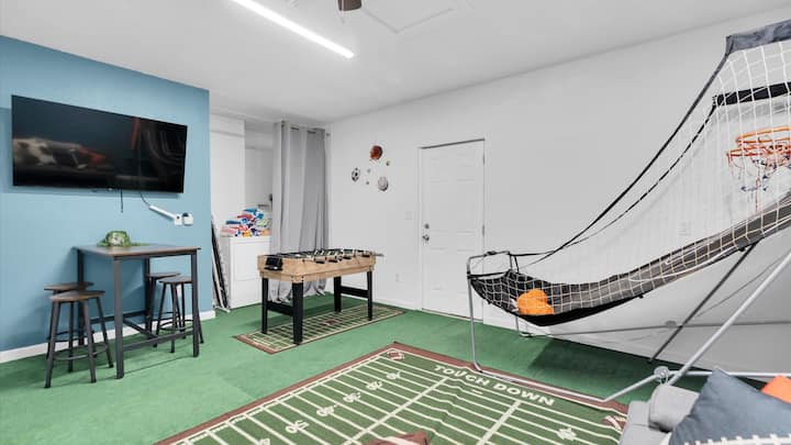 Გარე ოაზისი - გაემართეთ უკანა ეზოში თქვენი პირადი დასვენებისთვის! Დიდი ეკრანიანი სივრცე გამოირჩევა გათბობით აღჭურვილი აუზით, სასადილო მაგიდით გარე კვებისთვის, მყუდრო ტახტებით დასასვენებლად და 62-დუიმიანი ტელევიზორით თქვენი საყვარელი გადაცემებისა თუ თამაშების საყურებლად სუფთა ჰაერზე.