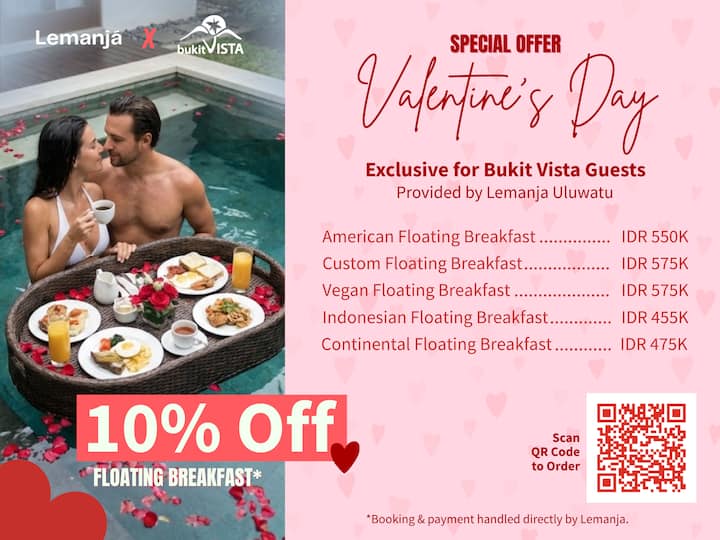 მიირთვით რომანტიკულად მოწყობილი საუზმე წყალზე, რომელსაც Lemanja Uluwatu გთავაზობთ მხოლოდ Bukit Vista‑ს სტუმრებს თებერვალში. აირჩიეთ ამერიკული (550 000 ინდონეზიური რუპია), ინდივიდუალური (575 000 ინდონეზიური რუპია), ვეგანური (575 000 ინდონეზიური რუპია), ინდონეზიური (455 000 ინდონეზიური რუპია) ან კონტინენტური (475 000 ინდონეზიური რუპია) სამზარეულო. მოქმედებს 10%‑იანი ფასდაკლება სტუმრებისთვის. შეკვეთასა და გადახდას პირდაპირ Lemanja მართავს. QR‑კოდი მოცემულია განცხადების ფოტოზე.