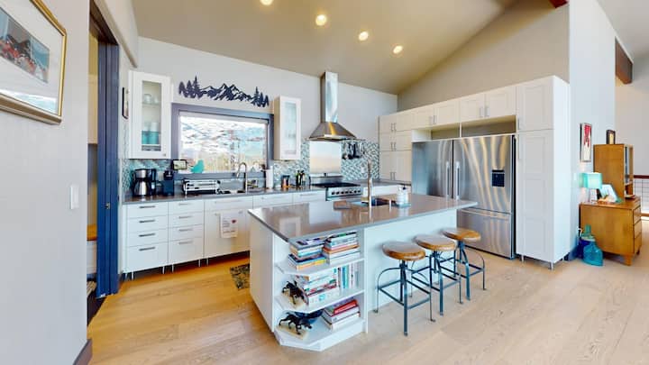 Სამზარეულო: სრულად აღჭურვილი, ღიაა საოჯახო და სასადილო ოთახებისთვის, წვეთოვანი და Keurig-ის ყავის მადუღარები, ჭურჭლის სარეცხი მანქანა, პროფესიონალური კლასის გაზქურა, 3 ადგილი სამზარეულოს დახლთან, 4 მაგიდასთან დივნის უკან და სასადილო მაგიდა 8 სკამით