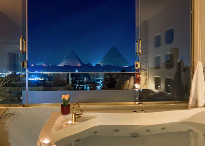 Გოლდა პირამიდების ყურის პანორამული პირამიდების ხედი ჯაკუზზე