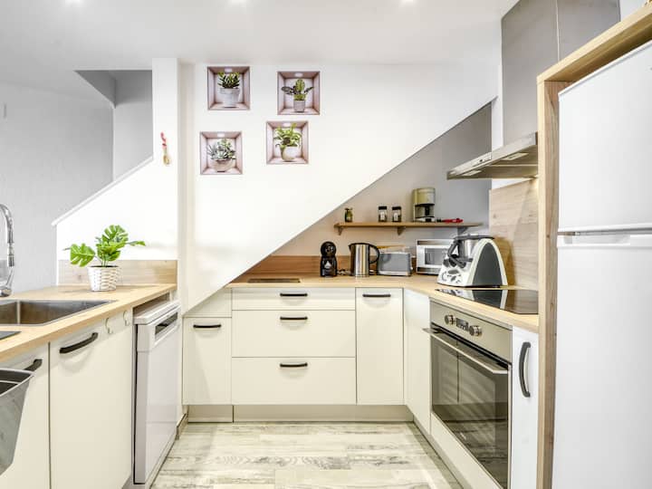 Პატარა, ღია სამზარეულო (ღუმელი, ჭურჭლის სარეცხი მანქანა, 3 ინდუქციური ცხელი თეფში, ჩაიდანი, მიკროტალღური ღუმელი, საყინულე, ყავის ელექტრო აპარატი). Ზედა სართული: 1 ოთახი 1 ფრანგული საწოლით (160 სმ, სიგრძე 190 სმ), კონდიციონერით და ჰაერის იძულებითი გათბობით. Გასვლა აივანზე, ჩრდილოეთით მდებარე პოზიციაზე. Საშხაპე/სველი წერტილი. ტერასა 10 მ2, სამხრეთით მიმართული პოზიცია და დასავლეთისკენ მიმართული ტერასა 6 მ2, ჩრდილოეთით მდგარი პოზიცია. Ტერასის ავეჯი. პანორამული ხედი ზღვაზე, მთებსა და არხზე. Აღჭურვილობა: სარეცხი მანქანა, უთო, ფენი. Ინტერნეტი (Wi ‑ Fi, უფასო). გაითვალისწინეთ: მხოლოდ არამწეველები. Ტელევიზორი მხოლოდ FR, ES. // რეგ. Nr.: ESFCTU0000170200001300950000000000000009