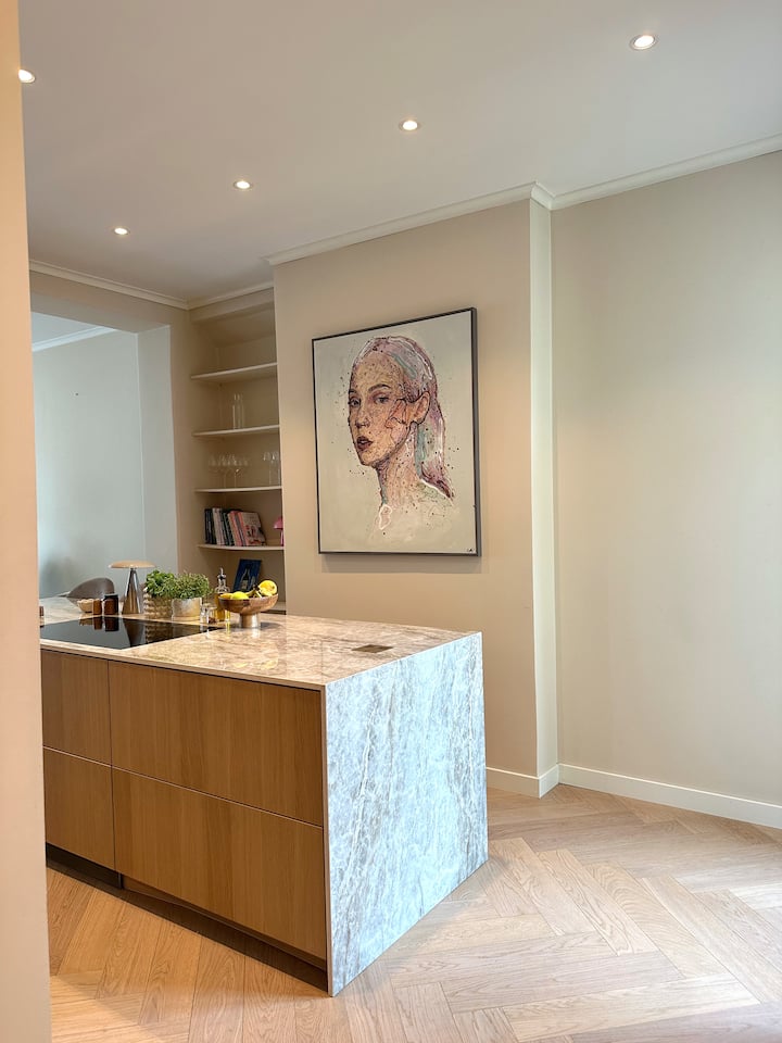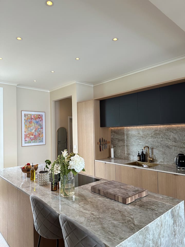 Დახვეწილი ბინა სამზარეულოს დიდი კუნძულით