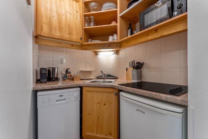 Ამ საცხოვრებელში არის სრულად აღჭურვილი სამზარეულო ჭურჭლის სარეცხი მანქანით, რაკეტის აპარატით, მიკროტალღური ღუმელით, Nespresso-ს ყავის აპარატით, ჩაიდნით, ტოსტერით,... ; მისაღები ოთახი დივნითა და ტელევიზორით და სასადილო სივრცე 6 სტუმრისთვის. Სააბაზანო სააბაზანოთი და ცალკე უნიტაზით სრულდება ეს კომპლექტი.