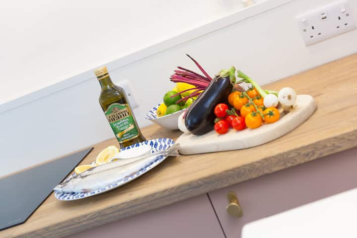 Სრულად აღჭურვილი სამზარეულო ერთადგილიანი ღუმელით. Ინდუქციური ქურა. Undercounter მაცივარი ყინულის ყუთით. Ჭურჭლის სარეცხი მანქანა. მიკროტალღური ღუმელი. ჩაიდანი. Ტოსტერი. ბელფასტის ნიჟარა. კარადების სარეცხი მანქანა/საშრობი. Რობერტსის რადიო. 2 × პერიოდული სკამები გვერდითი მაგიდით. Სასადილო მაგიდა და სკამები.