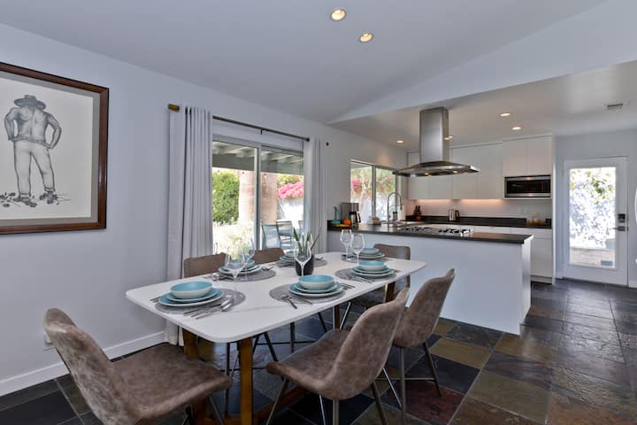 Კუთხეში მდებარე ამ საცხოვრებლიდან იშლება დიდებული მთების განუწყვეტელი ხედები, რომლებიც მზის ამოსვლიდან მზის ჩასვლამდე განსაცვიფრებელ ფონზე იშლება. Მნიშვნელობა არ აქვს, პატიოზე მიირთმევთ თუ მისაღები ოთახის კომფორტს, ეს თვალწარმტაცი ხედები აუმჯობესებს სახლის მშვიდ და თვალწარმტაც ატმოსფეროს. Ეს საკუთრება უკიდურესად კერძოა, თუმცა ის ჯერ კიდევ მდებარეობს ცენტრალურ ნაწილში. Თქვენ აღმოჩნდებით რამდენიმე წუთის სავალზე სხვადასხვა ბარიდან, რესტორნიდან და მაღაზიიდან, რომ აღარაფერი ვთქვათ პალმ-სპრინგზის ცენტრში. Ბაზრები და სასადილო ვარიანტები ფეხით სავალ მანძილზე, თქვენი ყველა საჭიროება მარტივად დაკმაყოფილდება.