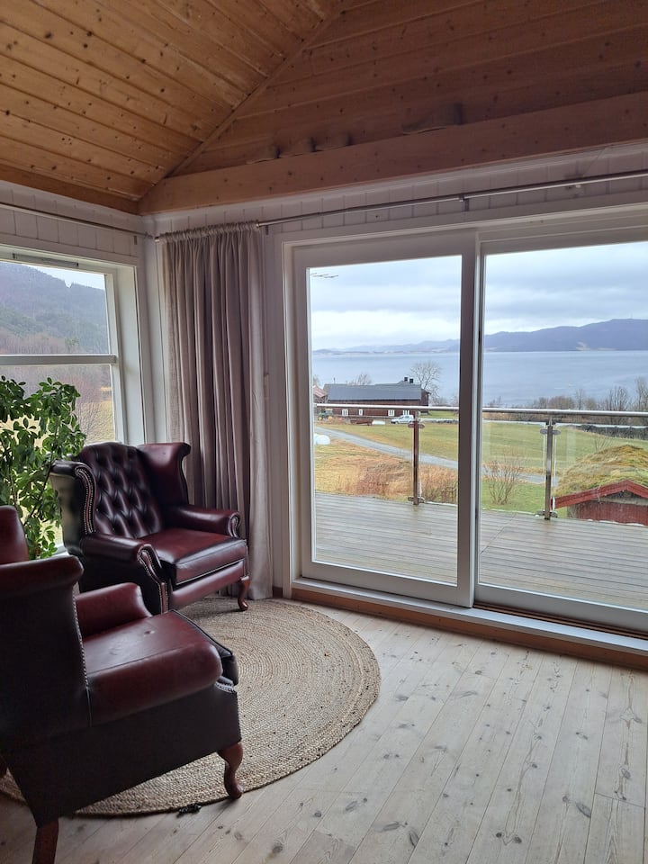 დიდი სახლი მთისა და ფიორდის პირდაპირ, პატარა ნავით.