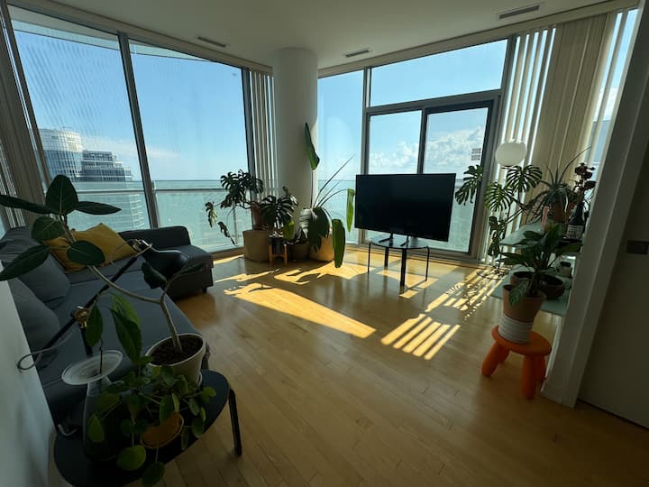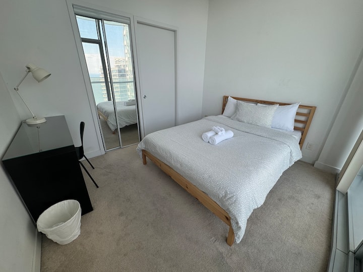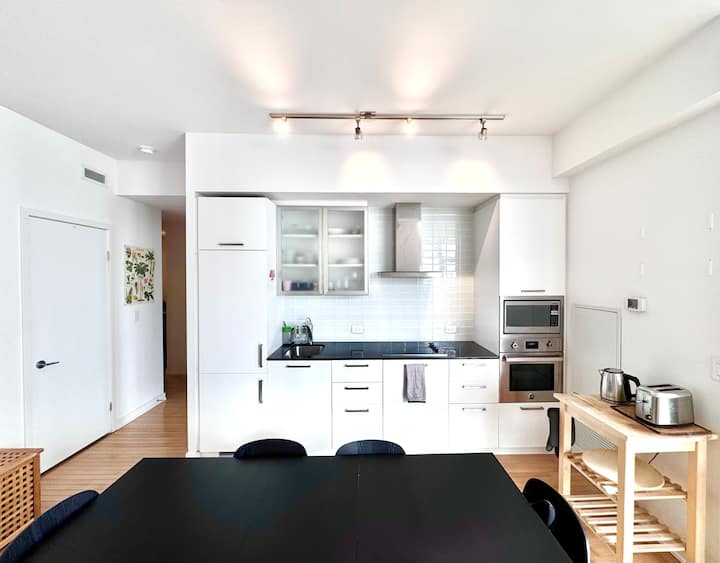 Მოგესალმებათ ჩვენი დახვეწილი 2-საძინებლიანი, 2-საძინებლიანი კონდომინიუმი ტორონტოს ცენტრში! Იატაკიდან ჭერამდე თვალწარმტაცი ფანჯრებით, მყუდრო საცხოვრებელი სივრცითა და სრულად აღჭურვილი სამზარეულოთი აღჭურვილი ეს ბინა იდეალურია სამუშაოდ ან დასასვენებლად. Დატკბით CN Tower-ის განსაცვიფრებელი ხედებით, სარეცხი მანქანით/საშრობით და თანამედროვე დეკორით. Ნაბიჯები Union Station-დან, Scotiabank Arena-დან და წყლის სანაპიროდან.