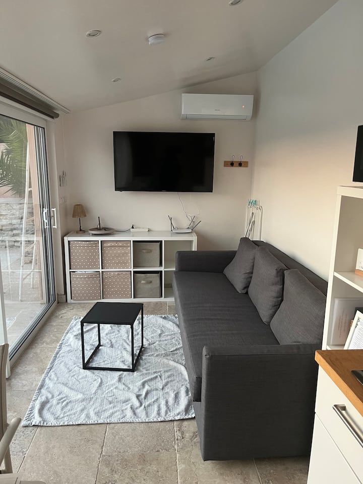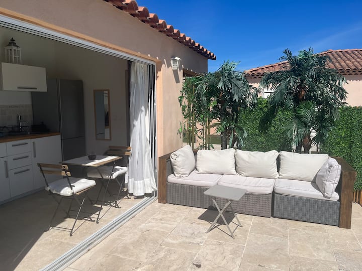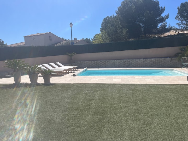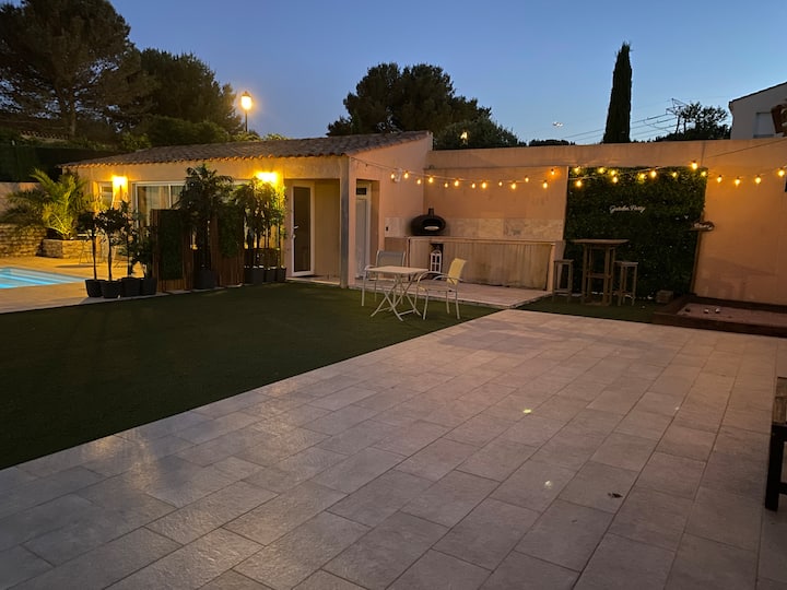 15 კვ.მ‑ის სტუდიოს ბაღში მდებარე საცხოვრებელი აუზის პირასაა. მასში შესასვლელი დამოუკიდებლად, ბაღიდან არის. საცხოვრებელი განკუთვნილია 2 ადამიანისთვის. აქვეა: კონდიციონერი ან გათბობა, გასაშლელი დივანი, შინაგანი დაბნელების ფარდა, ტელევიზორი, სამზარეულოს სივრცე, იტალიური საშხაპე და ტუალეტი, რომელიც მხოლოდ გარედან არის ხელმისაწვდომი, მაგრამ თქვენი სურვილისამებრ შეიძლება გათბეს. მზიანი კერძო ბაღი და აუზი მაგიდითა და სკამებით, ასევე, შეზლონგებით. უფასო პარკირების ადგილი. საზოგადოებრივი ტრანსპორტი მარსელსა და ექს‑ან‑პროვანსში ძალიან ცუდად მოძრაობს. რეკომენდებულია ტრანსპორტირება .
