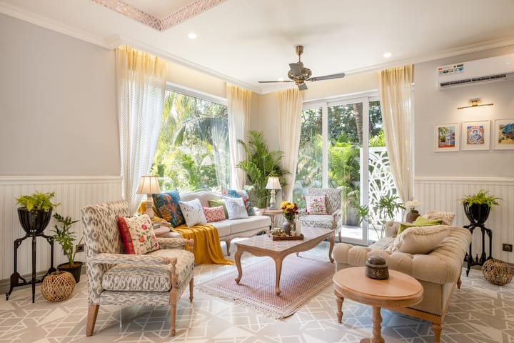 Ამ საოცრად ავთენტური გოან-პორტუგალიური სახლის გამორჩეული ლურჯ-თეთრი გარე პალიტრა სასიამოვნო პირველ შთაბეჭდილებას ახდენს, რაც მის საზღვაო თემატიკაზე მიანიშნებს და სიმბოლურ ხასიათს იძენს. Აივნები, სვეტები, ყალიბები, სვეტები, თაღები და რთული დიზაინის მქონე მოაჯირები უხვად ამშვენებს ფართო ვილის რეგალურ ნაგებობას, თუმცა შეიძლება გაგიკვირდეთ, რამდენად საოცრად მსუბუქი, ჰაეროვანი და კომფორტულია ის შიგნიდან.