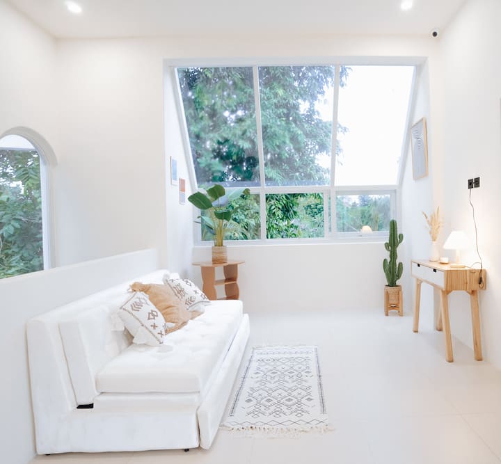 ჩემ მიერ შემოთავაზებული საცხოვრებლის უნიკალური მახასიათებელი: Ჩვენი ნახევრად შიდა სივრცე დიდი ფანჯრებით