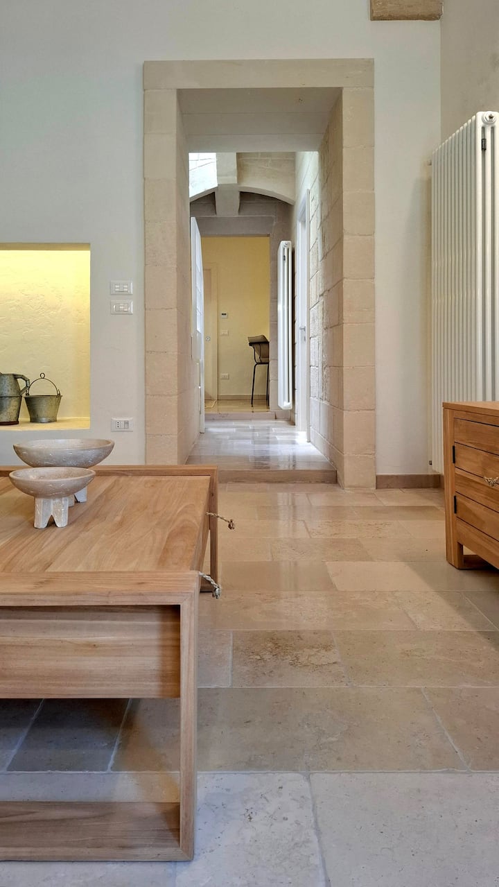 Მტკივნეულმა რესტავრაციამ შეინარჩუნა შენობაში არსებული ყველა ორიგინალური და, როგორც წესი, სალენტოს თავისებურებები: ვარსკვლავების საცავებიდან დაწყებული, ლეჩეს ქვის უძველესი კიბით დამთავრებული, ნამდვილი ხელოვნების ნიმუში და ქვისა, რომელიც თავისთავად წრეში ასვლას, ზედა სართულისა და ტერასისკენ მიდის, ყველა სიმბიოზი თანამედროვე ელემენტებით, როგორიცაა დიდი შუშის თხილამურები, რომლებიც ცის ფერებს უშვებს სახლში, ბრტყელი იატაკი, რომელიც მიესალმება სრულად ინტეგრირებულ კონდიცირების სისტემას შიგნით, მიკრო ცემენტი, რომელიც აძლიერებს ზედაპირების უწყვეტობის შეგრძნებას, „უხეშად მუშაობდა“ კედლების თაბაშირის თეთრს და მკაცრი გეომეტრიული ფორმებისა და მიზანმიმართულად მინიმალური დიზაინის ავეჯის არჩევანს.