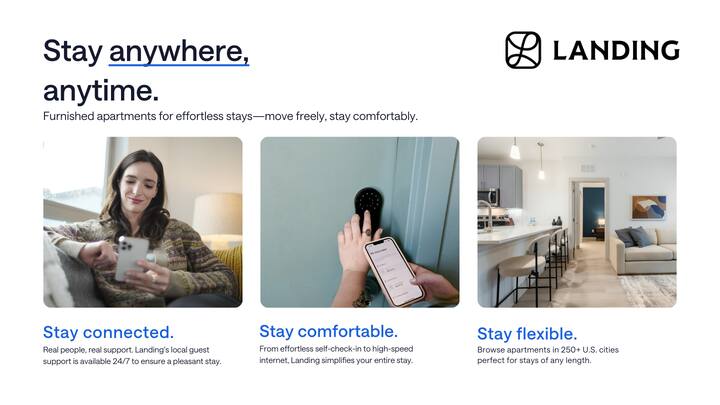 Landing არის კეთილმოწყობილი ბინების კოლექცია მთელი ქვეყნის მასშტაბით, სადაც ყველა საცხოვრებელი თავს ისე გრძნობს, როგორც საკუთარ სახლში. Თითოეული Landing აღჭურვილია დახვეწილი ავეჯით, სრულად აღჭურვილი სამზარეულოთი, შიდა სამრეცხაოთი, სამუშაო სივრცით, სწრაფი Wi ‑ Fi ქსელით და პრემიუმ-კლასის საყოფაცხოვრებო პირობებით. Იდეალურია ნებისმიერი ხანგრძლივობის ჯავშნებისთვის, მომხმარებელთა სადღეღამისო მხარდაჭერით.